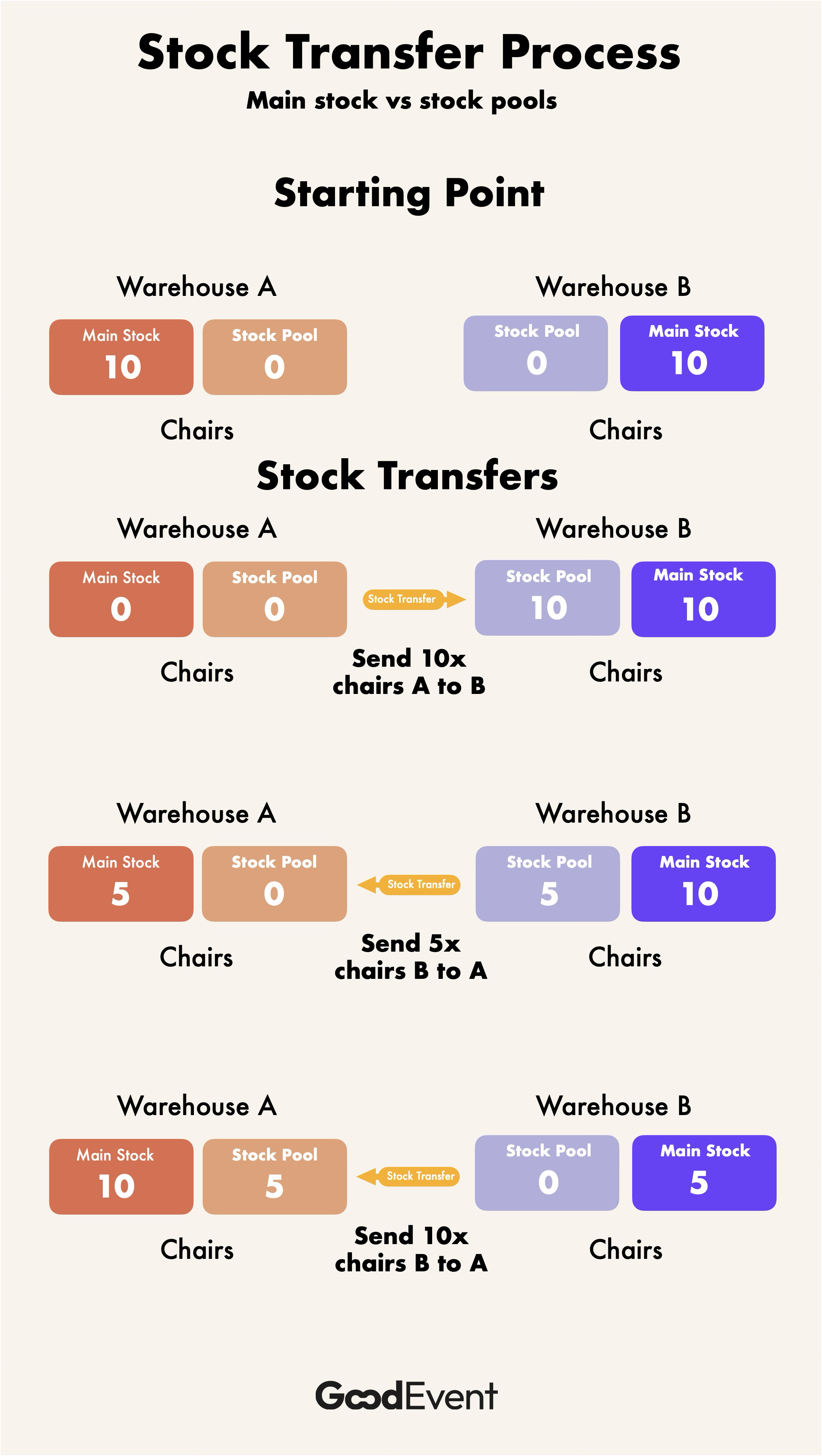 Instead, a transfer creates Stock Pool at the destination — items that are physically there, but still owned by the original location (sometimes described as in transit / on loan / allocated to another site). Pool stock is essentially: “stored here, but not counted as ours.”